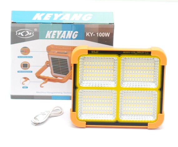 پروژکتور شارژی و خورشیدی 100 وات کیانگ مدل KY-100W یک ابزار بسیار پرکاربرد و چند منظوره است که با داشتن قابلیت های متنوع مناسب برای فضای باز، کمپینگ، کارگاهی، منازل و… می باشد